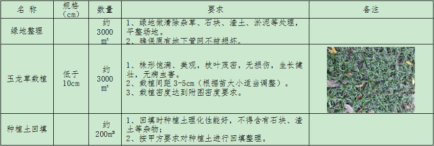 说明:1.本次报价中的数量为暂定数量,甲方有权根据实际情况调整移植面积,实际完成面积按实收方办理结算,中标方必须无条件服从业主单位的安排,否则视为违约,中标方承担一切责任。2.栽植完成后需中标方养护三个月。