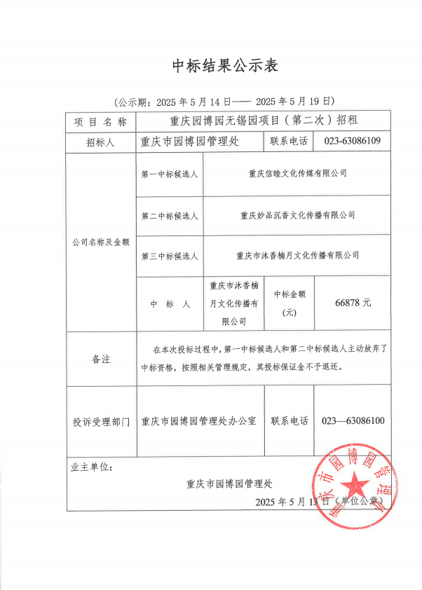重庆园博园无锡园(第二次)招租 中标结果公示表