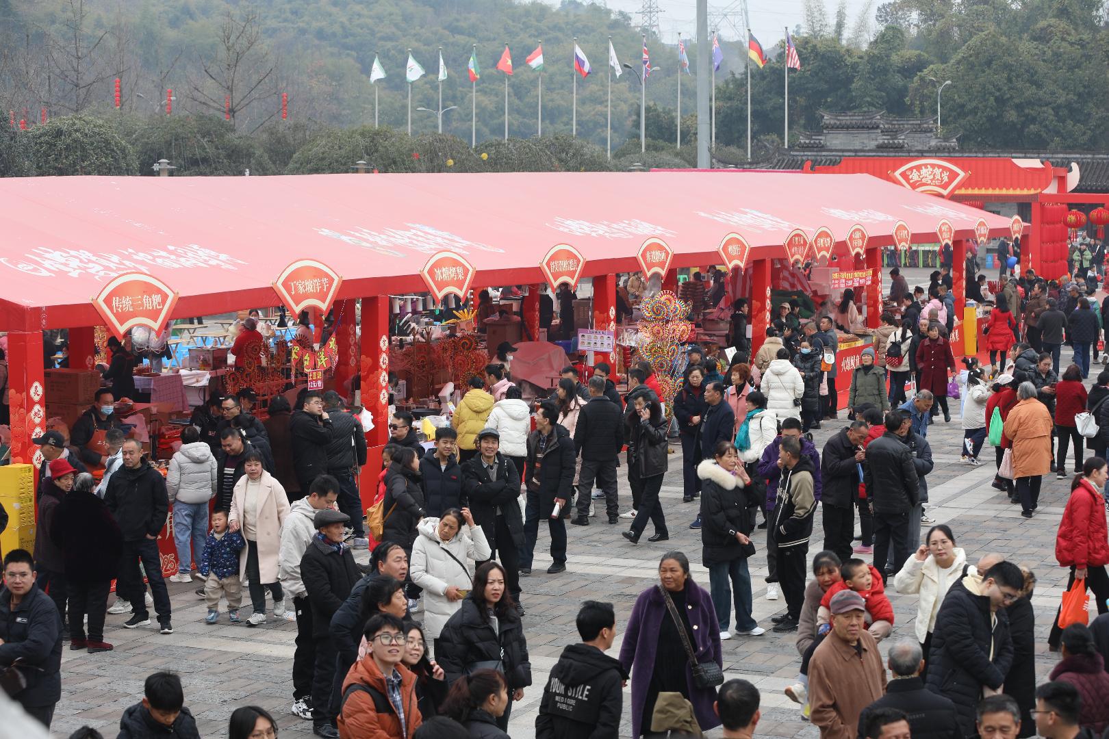 年味不止在视听间流淌,更藏在舌尖上的美食里。主广场的年货集市人头攒动,空气中弥漫着诱人的香气。传统三角粑、丁家坡洋芋、冰糖烤梨、火爆鱿鱼、凉粉凉面凉皮、冰糖葫芦、鲜榨果汁......各式各样的地道美食,让游客们感受到了舌尖上的年味儿。