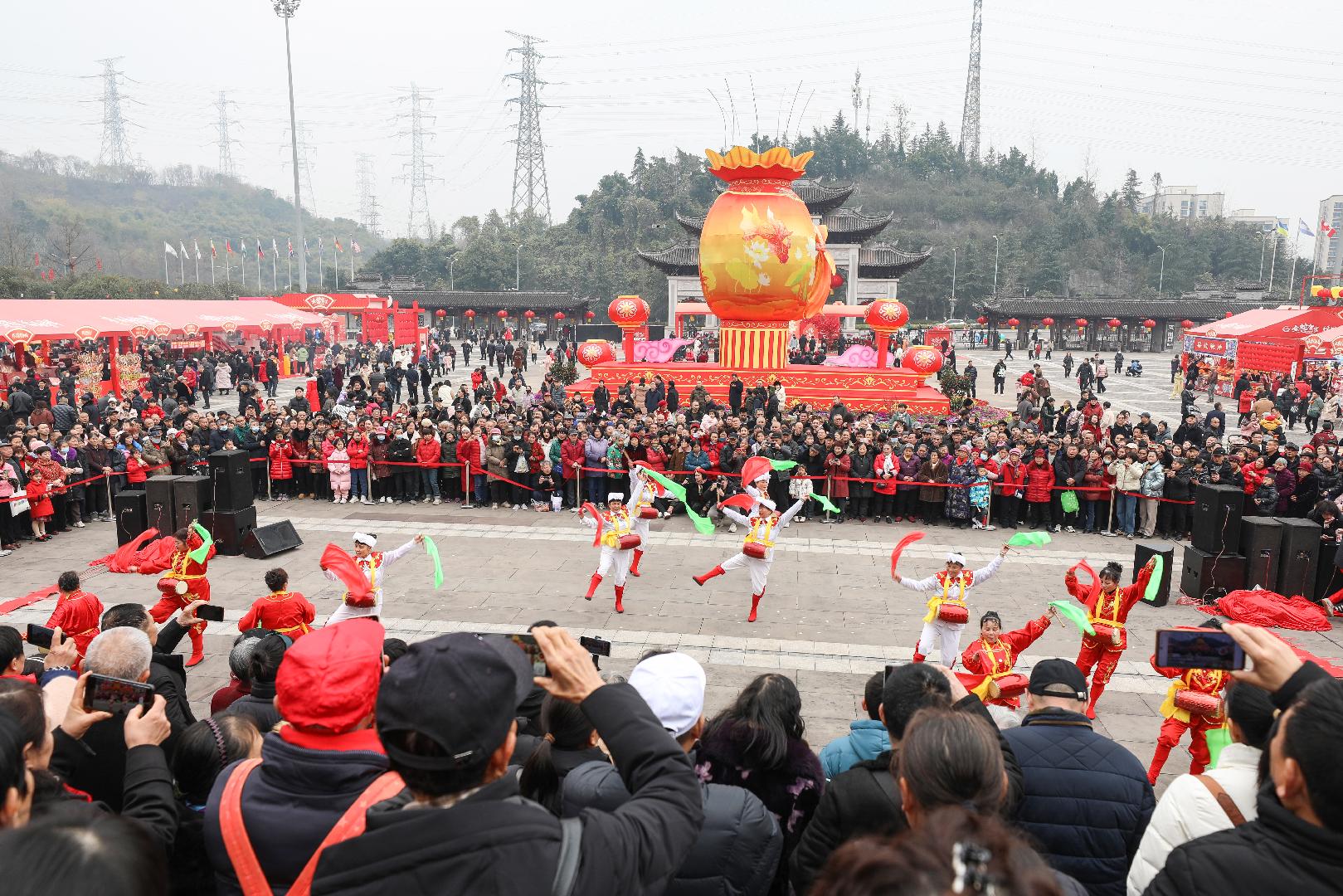 在露天剧场和主广场,巴渝民俗文化表演轮番登场。川剧变脸妙技惊艳全场,演员衣袖轻挥,脸谱瞬息变换,赢得掌声阵阵;陕北秧歌欢快喜庆,演员们红绸翻飞,热情洋溢;“车幺妹”展现巴渝风情,妙趣横生的演绎让游客忍不住跟着节奏摇摆。