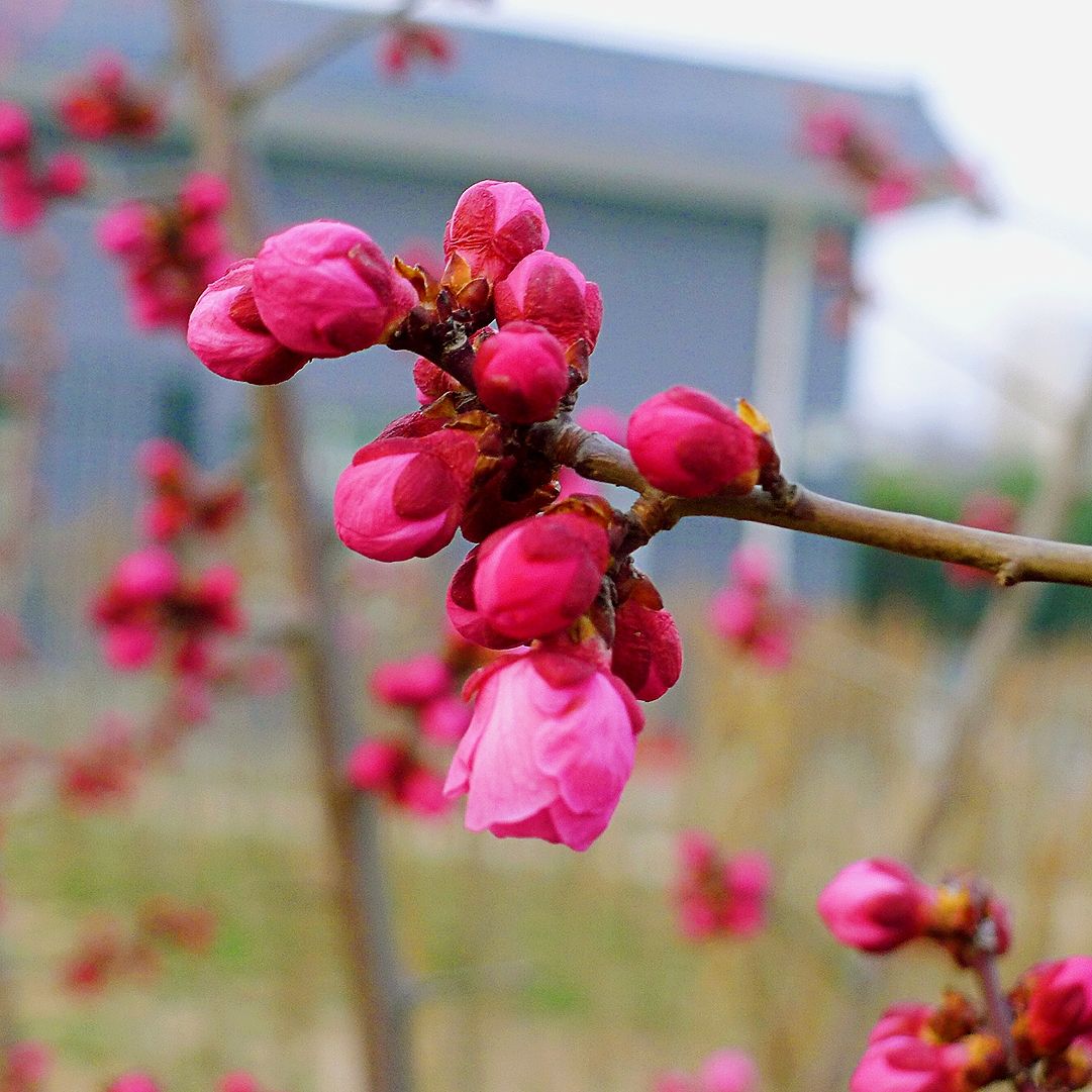 第五类是樱李梅类,乃紫叶李与宫粉梅之人工杂交种,紫叶红花,重瓣大朵,抗寒。