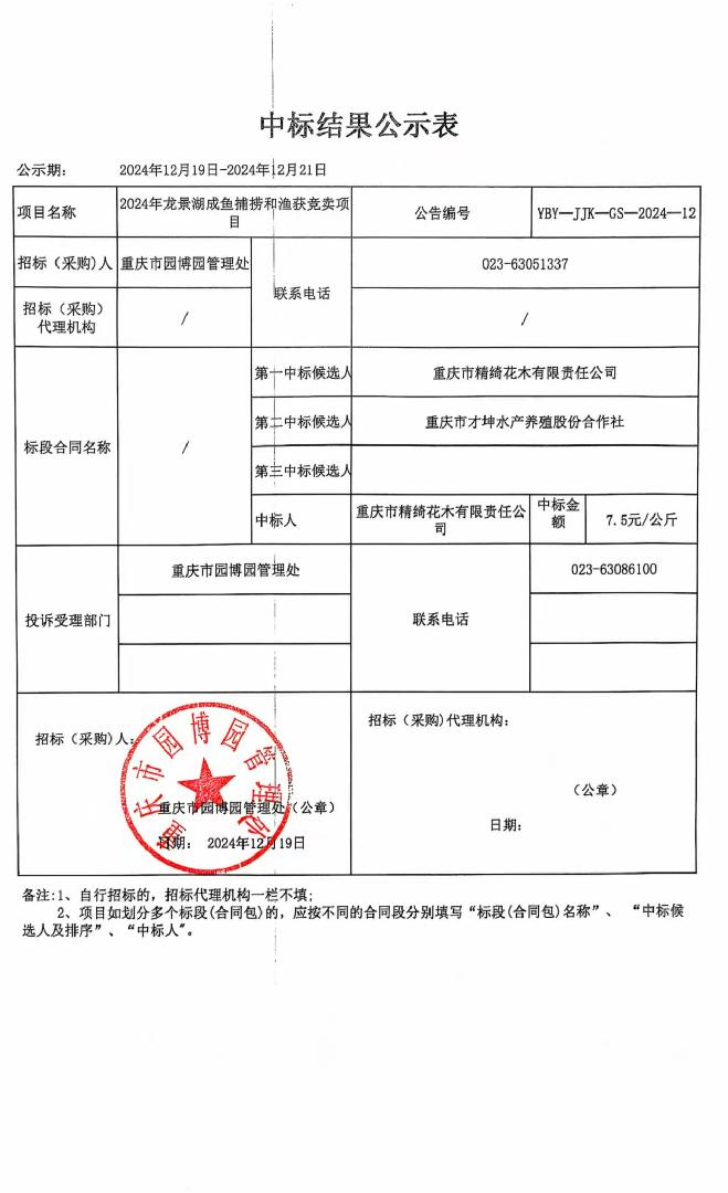 2024年龙景湖成鱼捕捞和渔获竞卖项目中标结果公示表