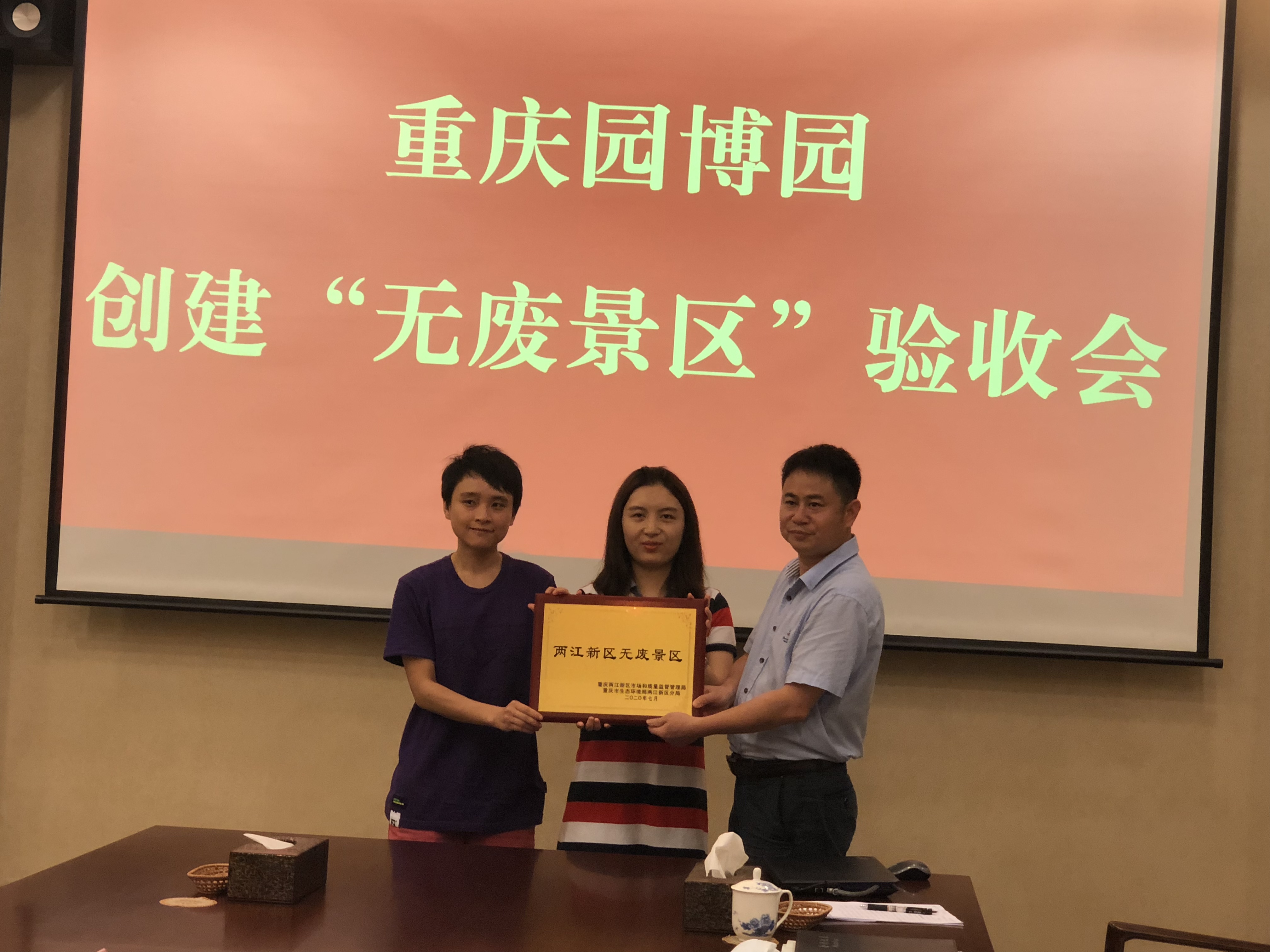 7月10日下午,市生态环境局两江新区分局、两江新区市场监管局组成的联合验收组一行来到重庆园博园,对重庆园博园创建“无废景区”、“无废公园”工作进行评估验收,现场授予重庆园博园“两江新区无废景区”、“两江新区无废公园”荣誉牌。园博园管理处副主任范庭兵及相关科室负责人陪同迎检。
